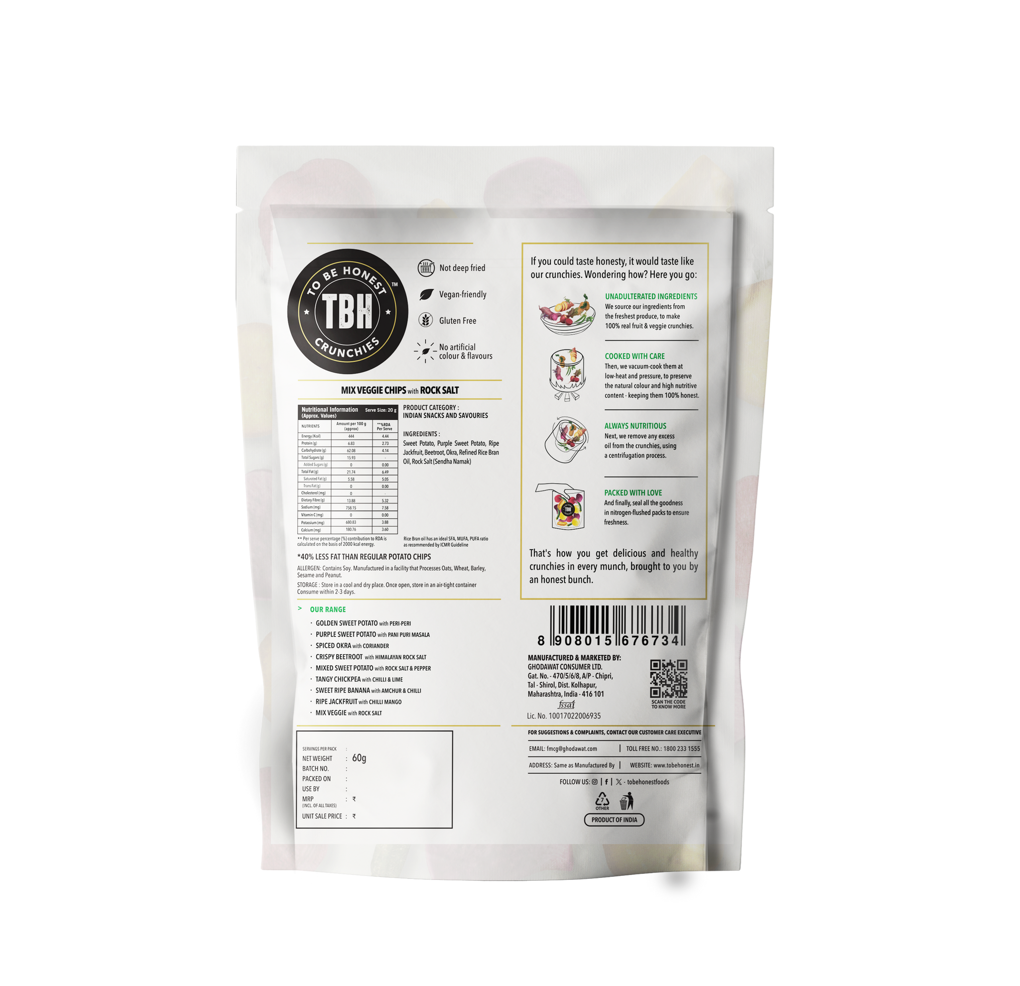 Experience snacking that’s guilt-free, colorful, and irresistibly crisp! Our TBH Mix Veggie Chips are crafted from real farm-fresh vegetables — Beetroot, Okra, Sweet Potato, Purple Sweet Potato, and Ripe Jackfruit — gently vacuum-cooked to lock in natural flavors and nutrients. Each chip bursts with earthy sweetness, light seasoning of rock salt, and a satisfying crunch that keeps you reaching for more.